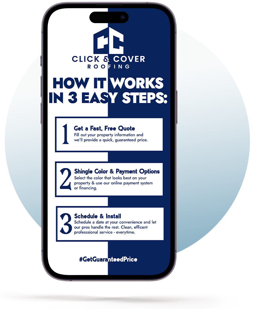 Getting a new roof has never been easier. With Click & Cover Roofing, you get a fast, accurate quote using satellite technology, schedule your installation at your convenience, and enjoy worry-free craftsmanship backed by a trusted warranty. It’s roofing, simplified — every step of the way.